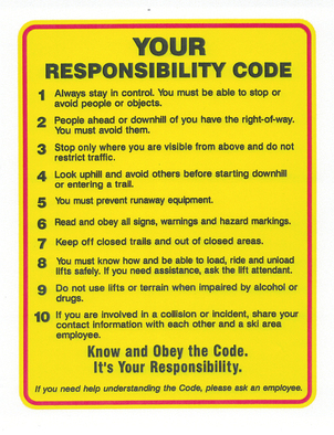 Common Sense, it's one of the most important things to keep in mind and practice when on the slopes. The National Ski Areas Association (NSAA) believes education, helmet use, respect and common sense are very important when cruising down the mountain. NSAA developed Your Responsibility Code to help skiers and boarders be aware that there are elements of risk in snowsports that common sense and personal awareness can help reduce.